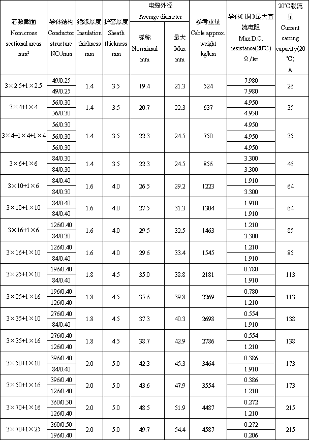 | 生產(chǎn)范圍 Production range of cable型號 Type額定電壓 Rated voltages V芯數(shù) NO.of cores標(biāo)稱截面 Nominal cross-sectional area mm2主線 Principal line地線 Ground wire控制線 Controlled lineU*10003112.5~70UP*10003112.5~70UY ●MY380/66031—4~70UYP ●MYP380/66031—4~70UYP ●MYP660/114031—4~70UC*1000312~710~50UC ●MC380/660313~716~50UCP*1000312~710~50UCP ●MCP380/660313~716~50UCPQ*114031335~70UCP ●MCP660/114031335~95UZ ●UZP ●MZ MZP300/5003112.5~4UYQ ●MYQ300/5002~12——1.0~2.5 |