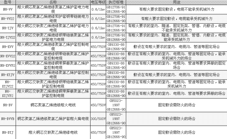 本產(chǎn)品適用于固定敷設(shè)需防火的場合。如高層建筑、地下鐵道、核電站、發(fā)電廠、機(jī)場、油田、化工廠及重要的工礦企業(yè)等與消防救生有關(guān)場合,同時(shí)又是應(yīng)急電源、消防泵、電梯、通訊信號(hào)系統(tǒng)必備電纜。